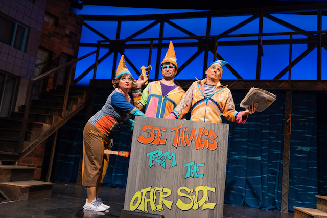 // Für AHA-Momente sorgen die dramaturgischen Kniffe im Bühnenbild von Tom Grasshof. Weil es im Staaetnhaus keine Drehbühne gibt und für Kulissenwechsel zu wenig Platz und Zeit ist,